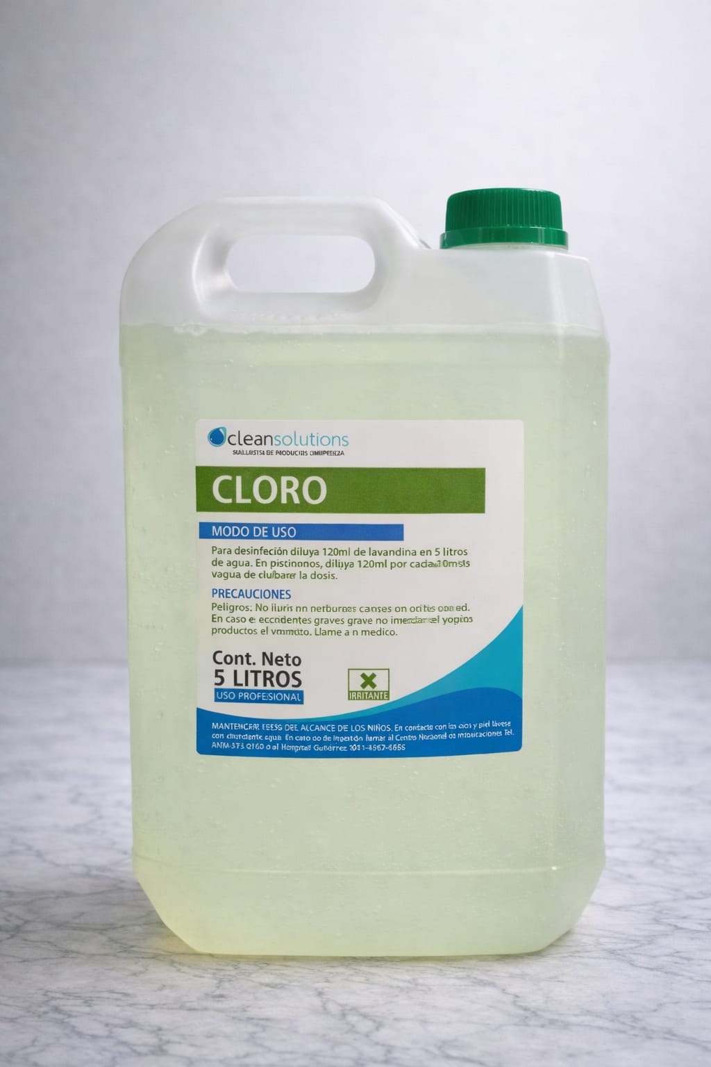 Cloro concentrado en presentación de 20 litros para uso industrial o comercial.