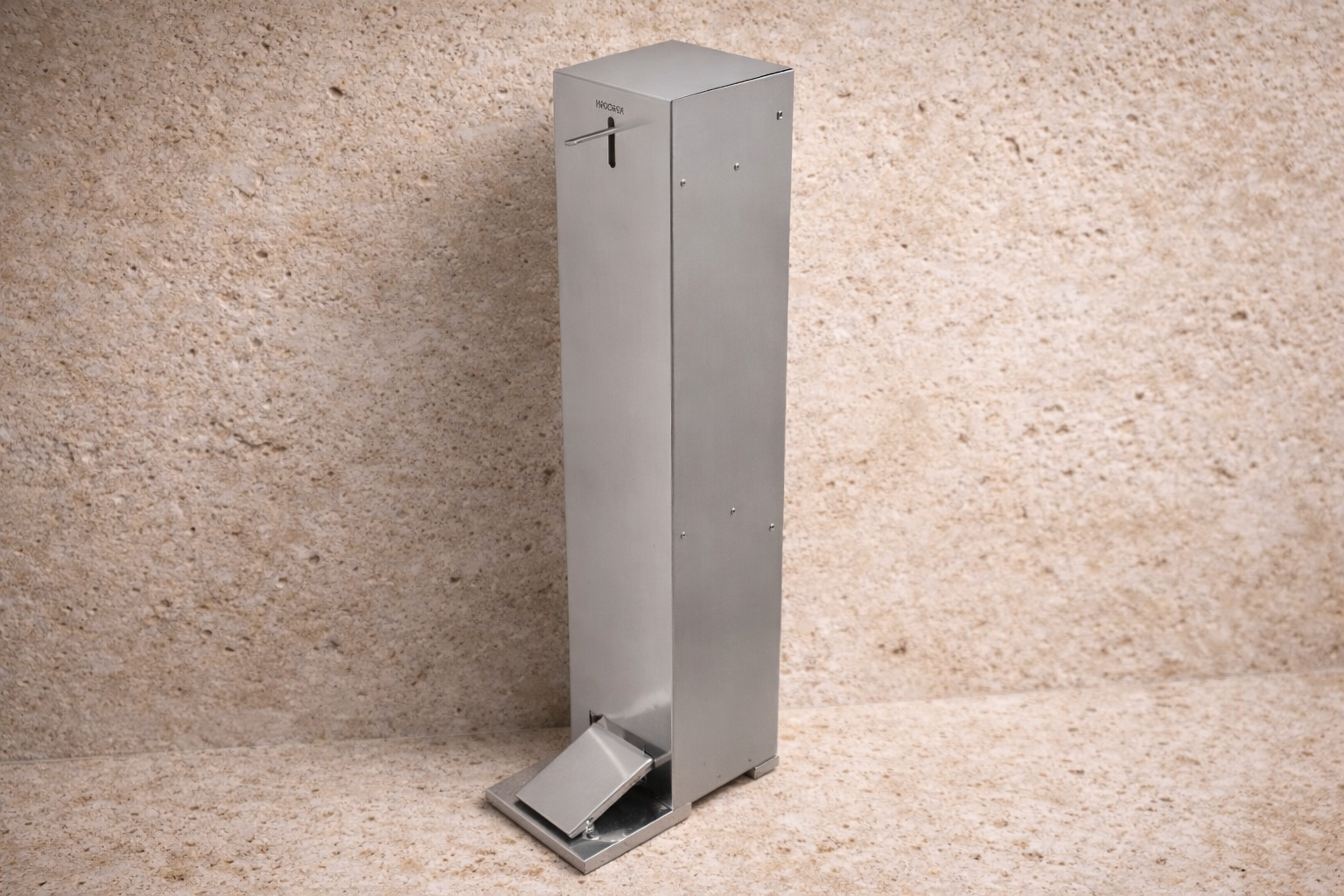 Dispensador de alcohol en gel operado a pedal, ideal para higiene en espacios públicos o laborales.
