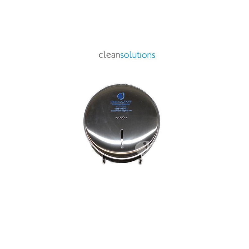 Dispensador de papel de 300 metros en acero inoxidable, ideal para ambientes de alta demanda.